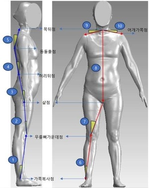 측면 자세각도 항목은 측면종아리각도(무릎_가쪽복사), 측면넓적다리각도(샅_무릎), 측면골반각도(뒤허리_샅), 측면등허리각도(등돌출_뒤허리), 측면목등각도(목뒤_등돌출)로 정하였으며, 정면 자세각도 항목은 정면종아리각도(무릎_가쪽복사), 정면허벅지각도(샅_무릎각도), 정면몸통각도(목뒤_샅), 오른어깨처짐각도(목뒤_오른어깨가쪽), 왼어깨처짐각도(목뒤_원어깨가쪽)로 하였다.