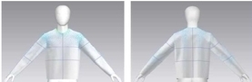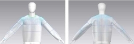 <표 11>의 Fit map과 접촉점 확인 사진에서 파란색 분포는 3D 토르소원형이 당김이나 조임이 없이 아바타에 접촉된 부분을 나타내는데, 3D 토르소원형이 목둘레, 어깨, 가슴 부위에 걸쳐 착의되어 있고, 아바타의 자세로 인해 진동둘레, 소매, 밑단 등에서 일부 파란색 분포를 나타냄을 확인할 수 있다. 특히 여자 95구간과 100구간 및 남자 105구간과 110구간 등의 앞면에서 이전 구간에 비해 파란색 분포가 증가하였는데, 이는 가슴 부위 두께가 커지는 큰 사이즈 체형의 특징을 나타낸다.